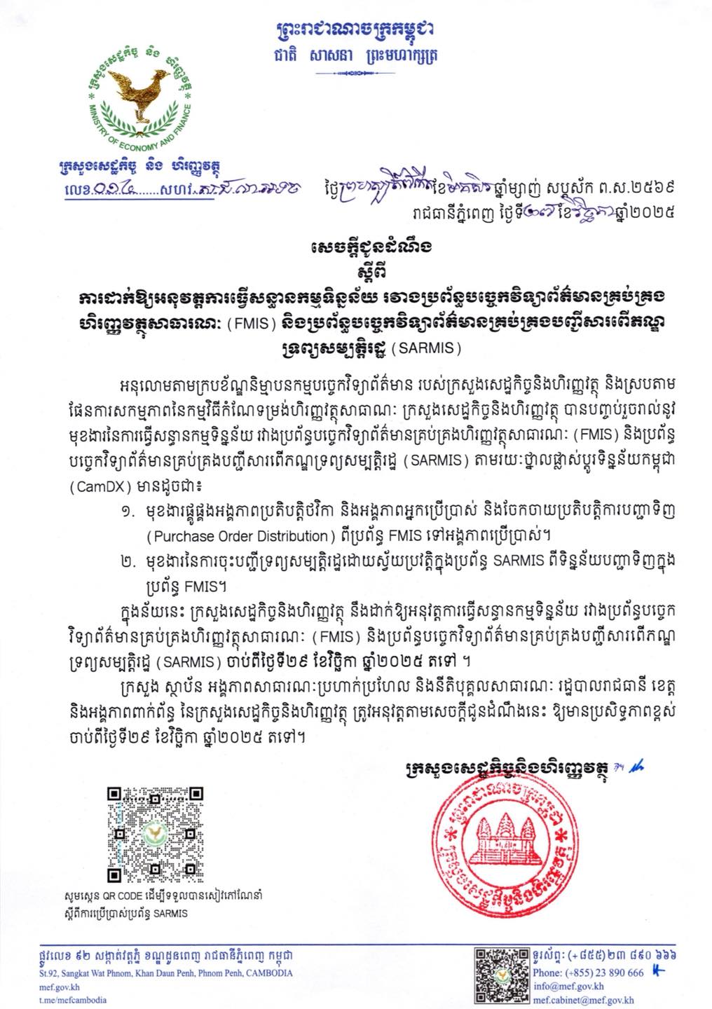 នាព្រឹកថ្ងៃពុធ ៣រោច ខែមិគសិរ ឆ្នាំរោង ឆស័ក ព.ស.២៥៦៨ ត្រូវនឹង ថ្ងៃទី១៨ ខែធ្នូ ឆ្នាំ២០២៤ លោកប្រធានមន្ទីរសេដ្ឋកិច្ច និងហិរញ្ញវត្ថុខេត្តបានចូលរួមពិធីប្រកាសដាក់ឱ្យប្រើប្រាស់ជាផ្លូវការនូវប្រព័ន្ធបច្ចេកវិទ្យាព័ត៌មានគ្រប់គ្រង បញ្ជីសារពើភណ្ឌទ្រព្យសម្បត្តិរដ្ឋ ជំនាន់ថ្មី ដល់ក្រសួង-ស្ថាប័នអង្គភាពសាធារណៈ ប្រហាក់ប្រហែល រដ្ឋបាលរាជធានី-ខេត្ត និងនីតិបុគ្គលសាធារណៈក្រោមអធិបតីភាពដ៏ខ្ពង់ខ្ពស់ របស់ឯកឧត្តម អគ្គបណ្ឌិតសភាចារ្យ អូន ព័ន្ធមុនីរ័ត្ន ឧបនាយករដ្ឋមន្ត្រី រដ្ឋមន្រ្តីក្រសួងសេដ្ឋកិច្ច និងហិរញ្ញវត្ថុ។ កិច្ចប្រជុំនេះប្រព្រឹត្ដិទៅនៅសាលប្រជុំសណ្ឋាគារសូហ្វីតែល ភូគីត្រាភ្នំពេញ។
