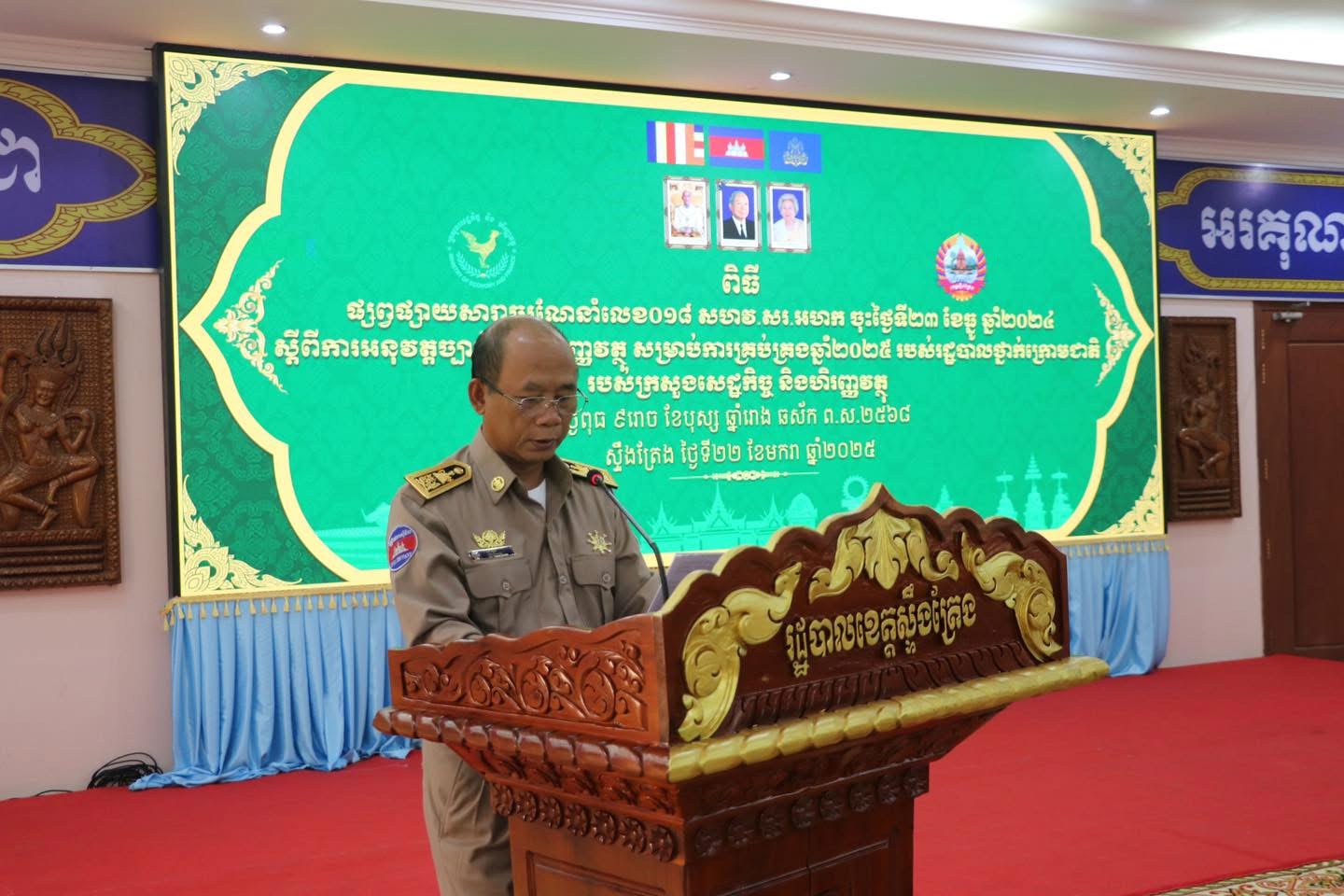 នារសៀលថ្ងៃពុធ ៩រោច ខែបុស្ស ឆ្នាំរោង ឆស័ក ព.ស. ២៥៦៨ ត្រូវនឹងថ្ងៃទី២២ ខែមករា ឆ្នាំ២០២៥ សាលប្រជុំធំរដ្ឋបាលខេត្តស្ទឹងត្រែងបានរៀបចំកិច្ចប្រជុំផ្សព្វផ្សាយសារាចរណែនាំ ស្តីពីការអនុវត្តច្បាប់ស្តីពីហិរញ្ញវត្ថុសម្រាប់ការគ្រប់គ្រងឆ្នាំ២០២៥ របស់រដ្ឋបាលថ្នាក់ក្រោមជាតិ ក្រោមអធិបតីភាព ឯកឧត្តម សុី សួន អភិបាលរង នៃគណៈអភិបាលខេត្ត,តំណាងក្រសួងសេដ្ឋកិច្ច និងហិរញ្ញវត្ថុ,លោកប្រធានមន្ទីរសេដ្ឋកិច្ច និងហិរញ្ញវត្ថុខេត្ត,លោកប្រធានរតនាគារខេត្ត,លោកនាយករងរដ្ឋបាលខេត្ត ព្រមទាំងមានការចូលរួមពីមន្រ្តីជំនាញ រដ្ឋបាលខេត្ត មន្ទីរសុខាភិបាលនៃរដ្ឋបាលខេត្ត ក្រុង ស្រុក មេឃុំ ចៅសង្កាត់ ស្មៀនឃុំ សង្កាត់ និងជំនួយការហិរញ្ញវត្ថុឃុំ សង្កាត់ក្នុងខេត្ត។