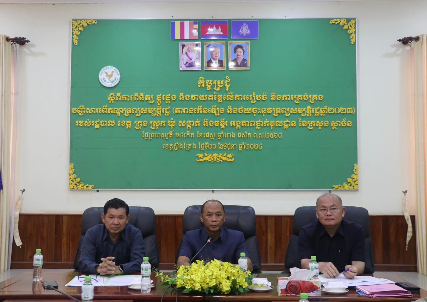 នាព្រឹកថ្ងៃចន្ទ ៥កើត ខែអស្សុជ ឆ្នាំរោង ឆស័ក ព.ស. ២៥៦៨ ត្រូវនឹង ថ្ងៃទី៧ ខែតុលា ឆ្នាំ២០២៤ មន្ទីរសេដ្ឋកិច្ច និងហិរញ្ញវត្ថុខេត្តបានរៀបចំកិច្ចប្រជុំពិនិត្យផ្ទៀងផ្ទាត់ទីតាំងដីរដ្ឋដែលបានចុះបញ្ជីសារពើភណ្ឌទ្រព្យសម្បត្តិរដ្ឋ ក្រោមវត្តមានលោក ម៉ែន ណារ៉េត អនុប្រធានមន្ទីរសេដ្ឋកិច្ចនិងហិរញ្ញវត្ថុខេត្ត និងមានការចូលរួមពីមន្ទីរជំនាញ អង្គភាព រដ្ឋបាលក្រុង ស្រុក ឃុំ សង្កាត់ពាក់ព័ន្ធ។
